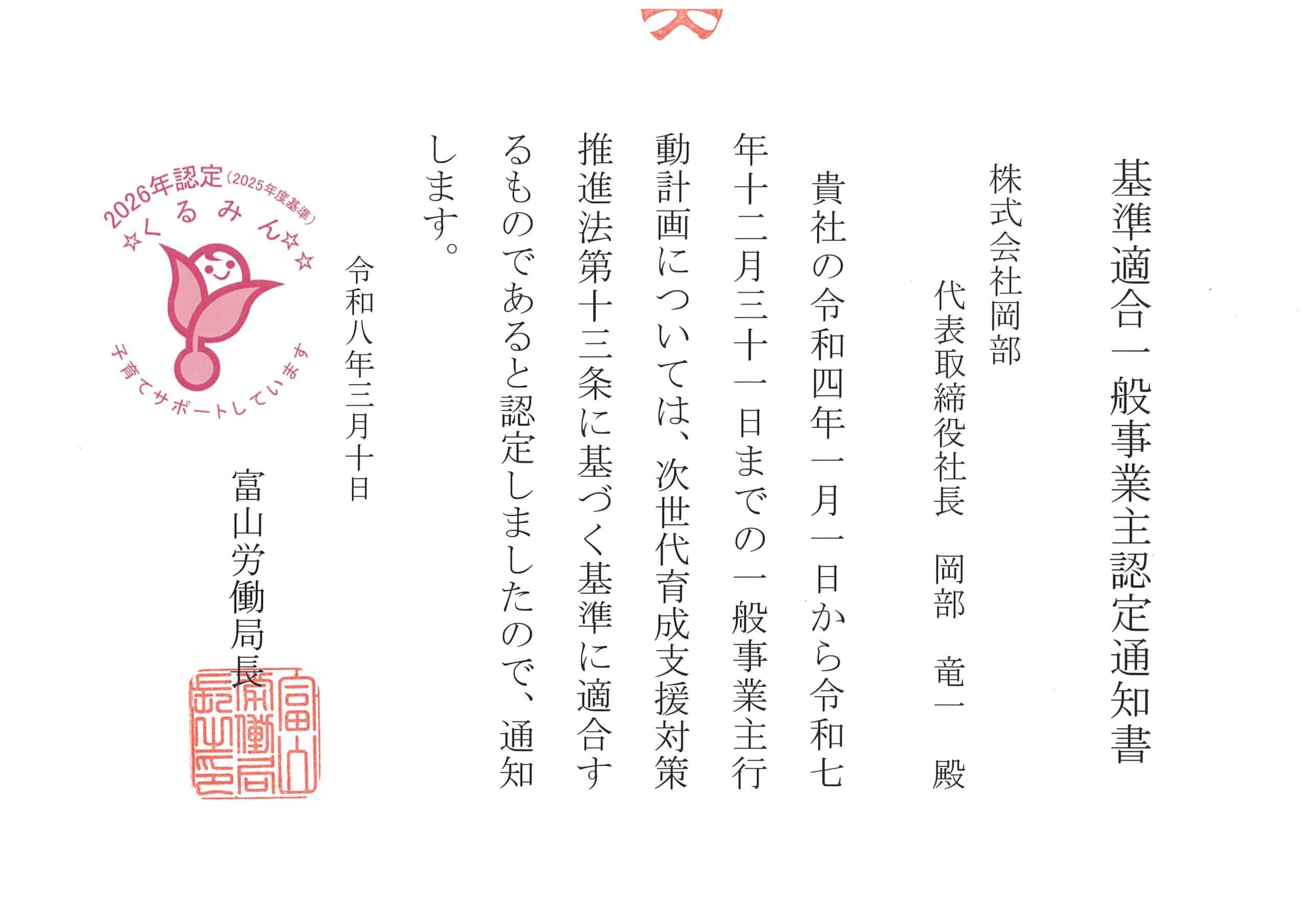 この度その計画目標を達成し、厚生労働省が定める基準を満たしたことから富山労働局長より基準適合一般事業主認定通知をいただき、3回目のくるみん取得となりました。