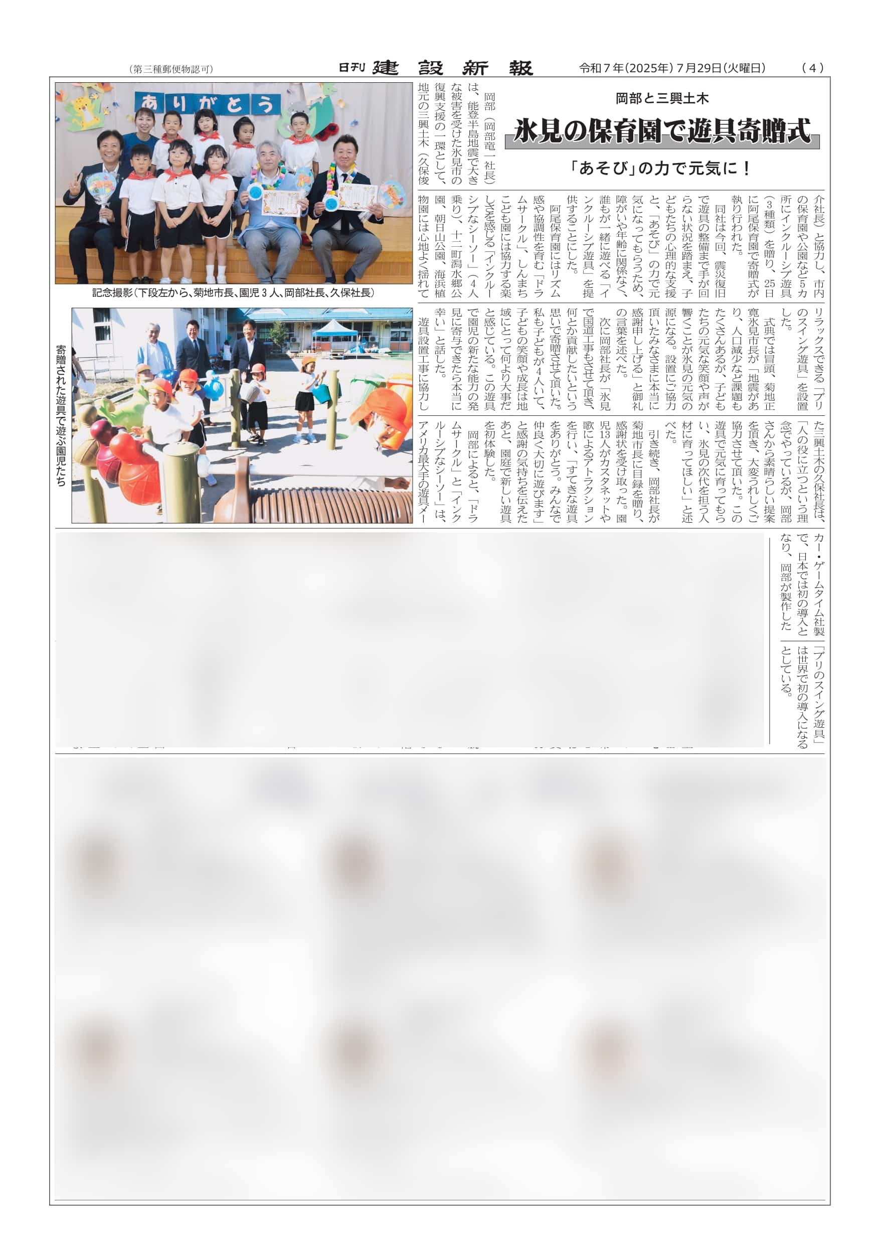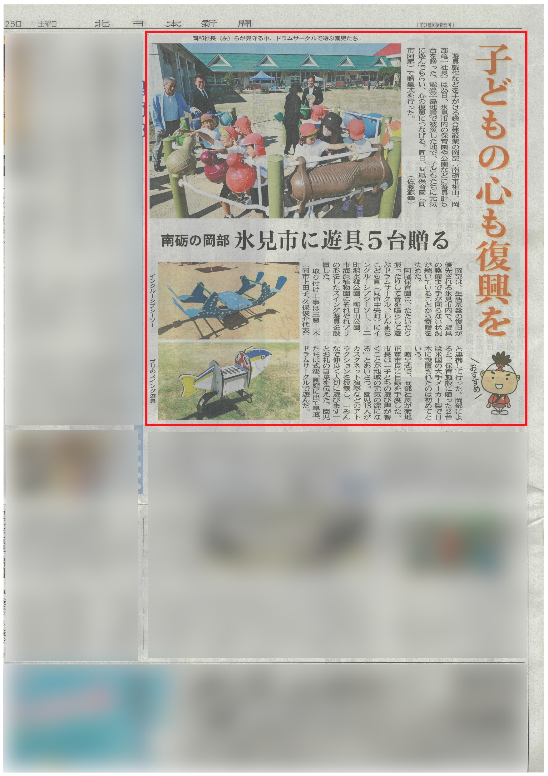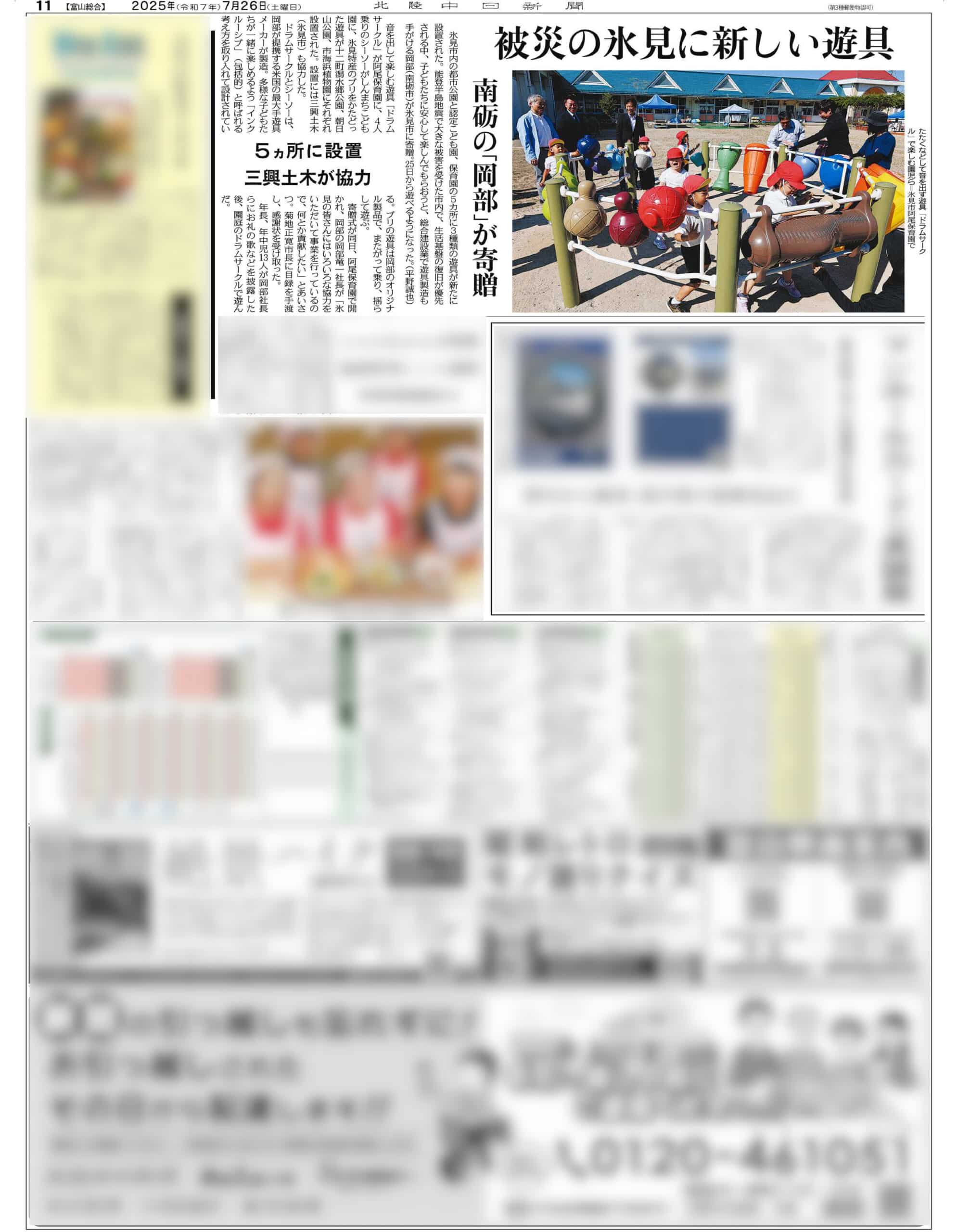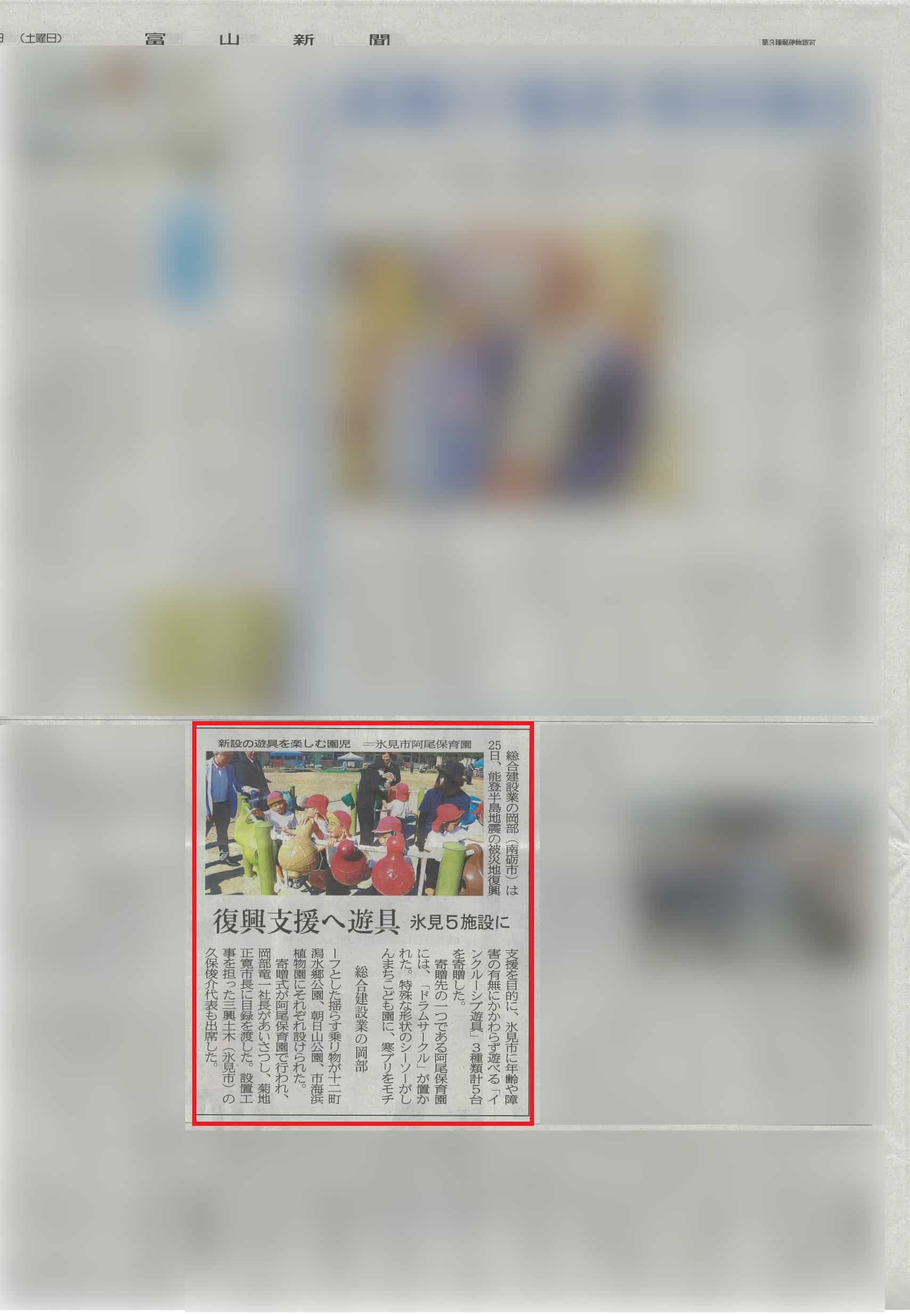 氷見市へ遊具寄贈、復興支援の取り組みがメディアで紹介されました