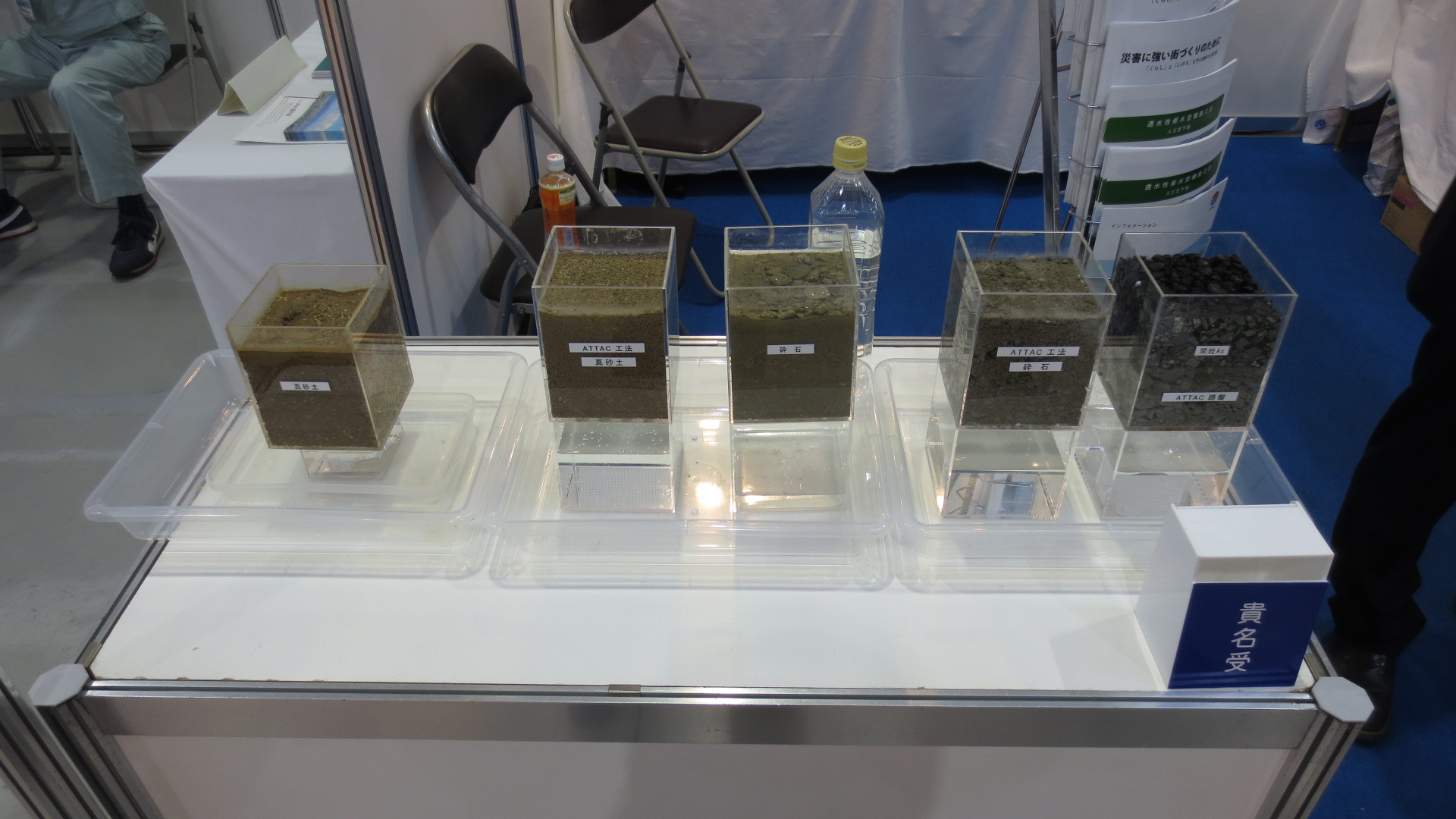 当社が出展したATTAC工法(透水性保水型工法)は土系舗装で、土を団粒化構造にすることで、透水性と保水性を高めた工法です。