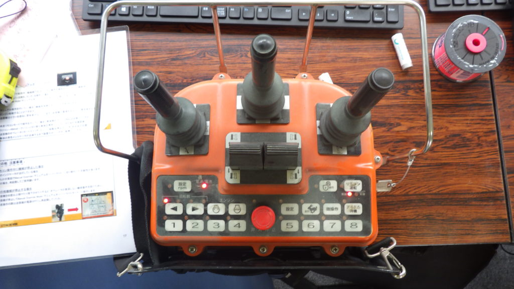 これがバックホウのラジコンです。真ん中の二つがキャタピラのレバー、左右の長細いレバーは通常の重機操作と同じ左右のレバー、真ん中は油圧アタッチメントを取り付けた場合のレバーです。