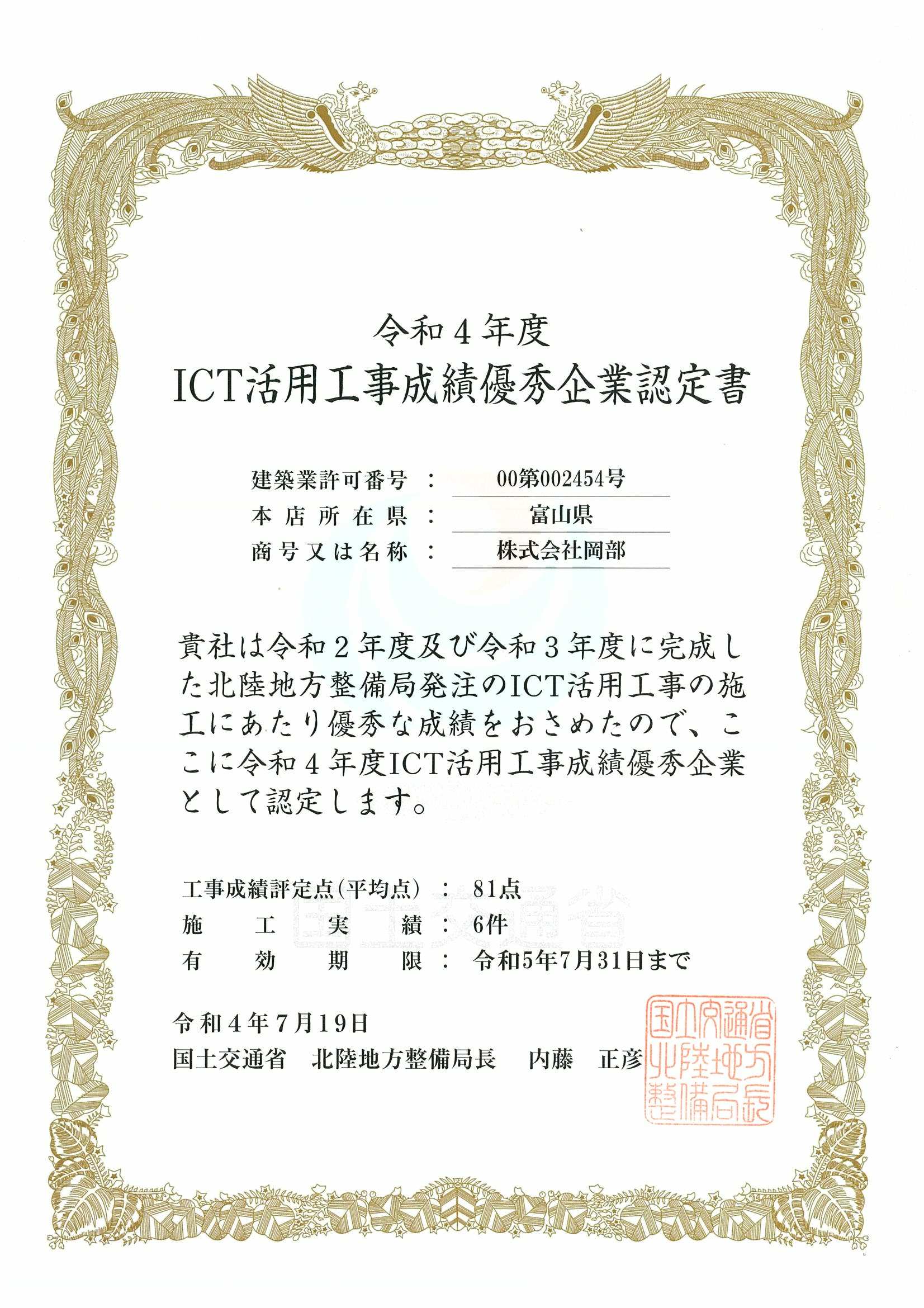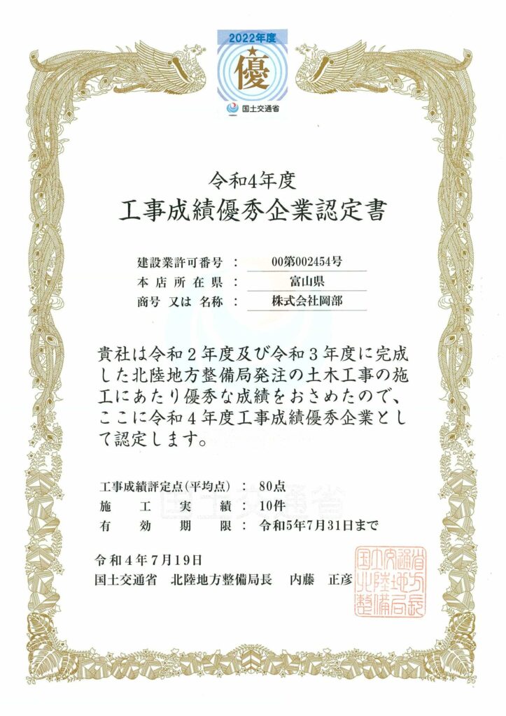 株式会社岡部は国土交通省北陸地方整備局から令和4年度工事成績優秀企業及びICT活用工事成績優秀企業に認定されました。