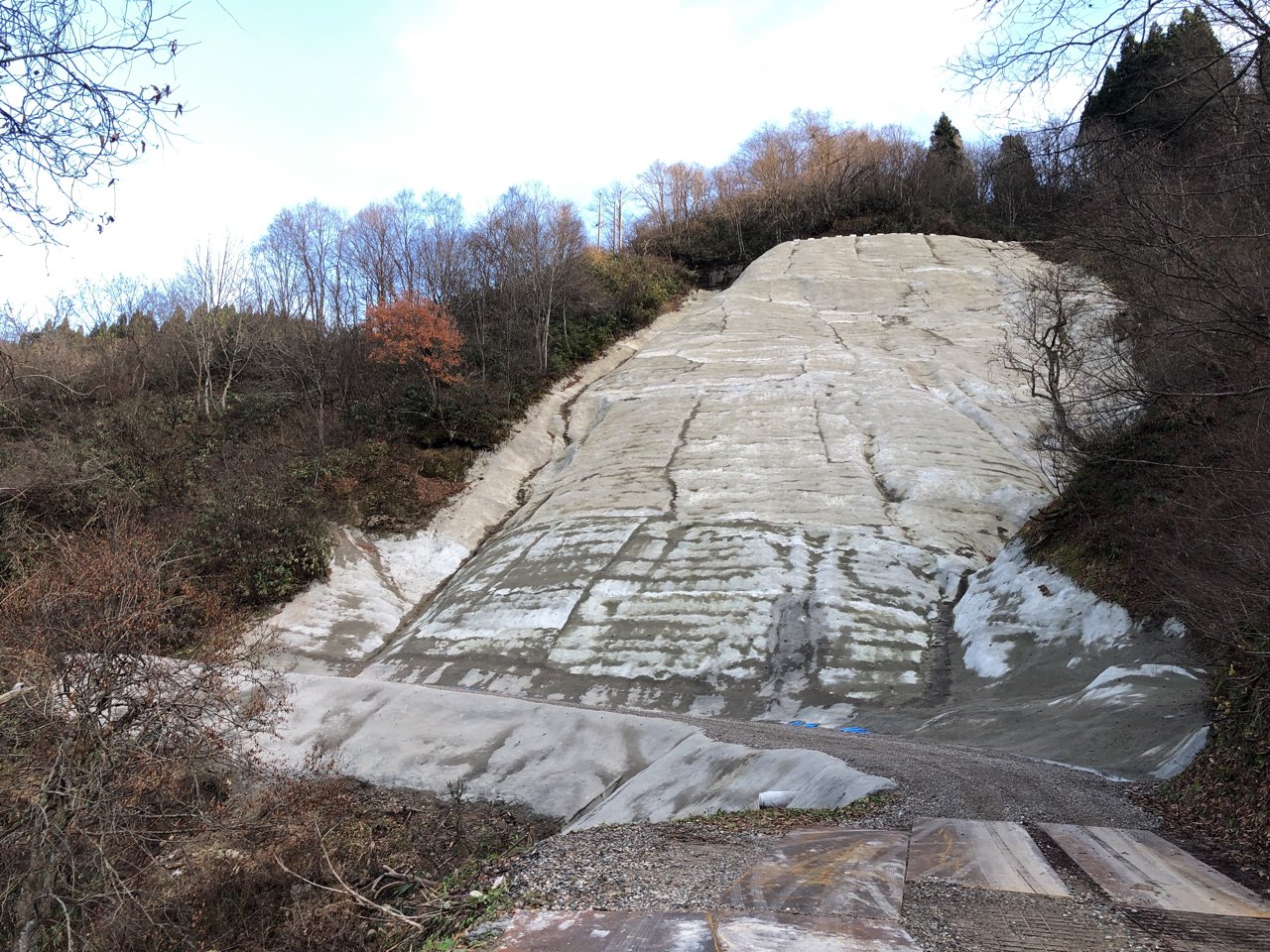 工事内容は、岐阜県高山市奥飛騨温泉郷一重ケ根地先において、崩壊した法面の保護・補強をする工事です。下の写真中央に四角いマスがたくさんあると思いますが、この四角いマスが【のり枠】という補強工法になります。今回工事も同様に【のり枠】を行い、写真中央のり枠の左側を対象に法面保護を行います!