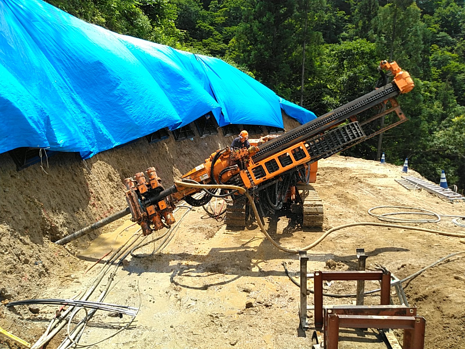 現在私たちの現場では、逆巻き施工により鉄筋挿入工、アンカー工を行っています。