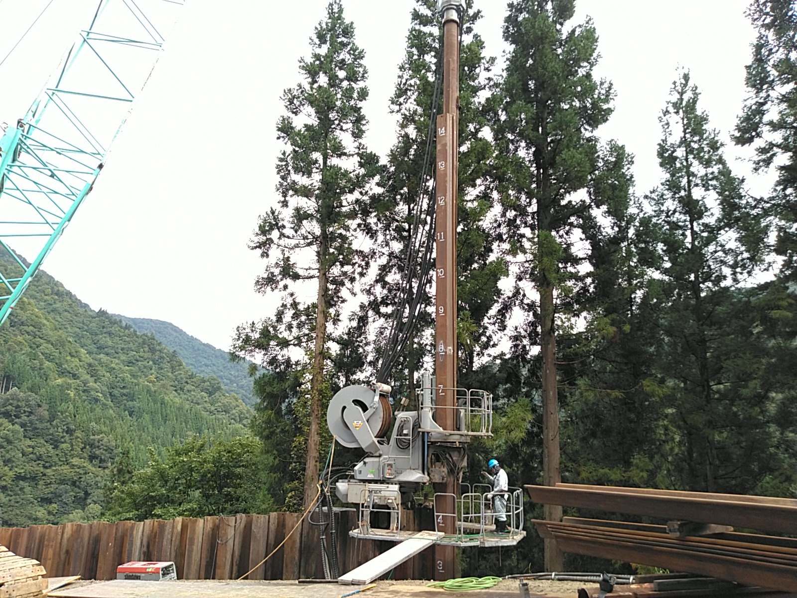 私たちの現場では現在、今回の工事のメインとなる鋼矢板の圧入を行っています。