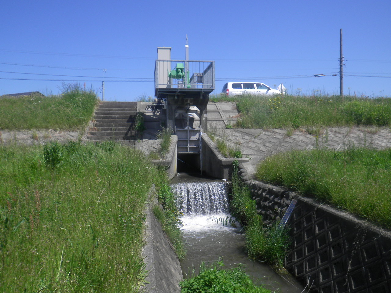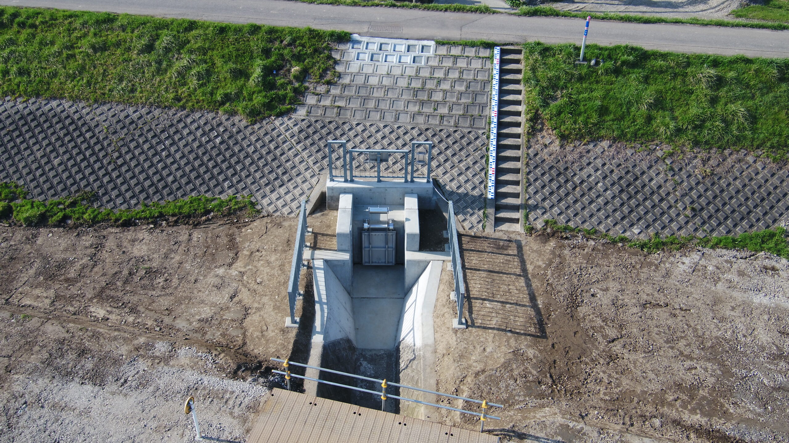 にて、排水樋管の無動力化に係る樋門・樋管工事です。2つの施工場所でそれぞれ施工を行います。