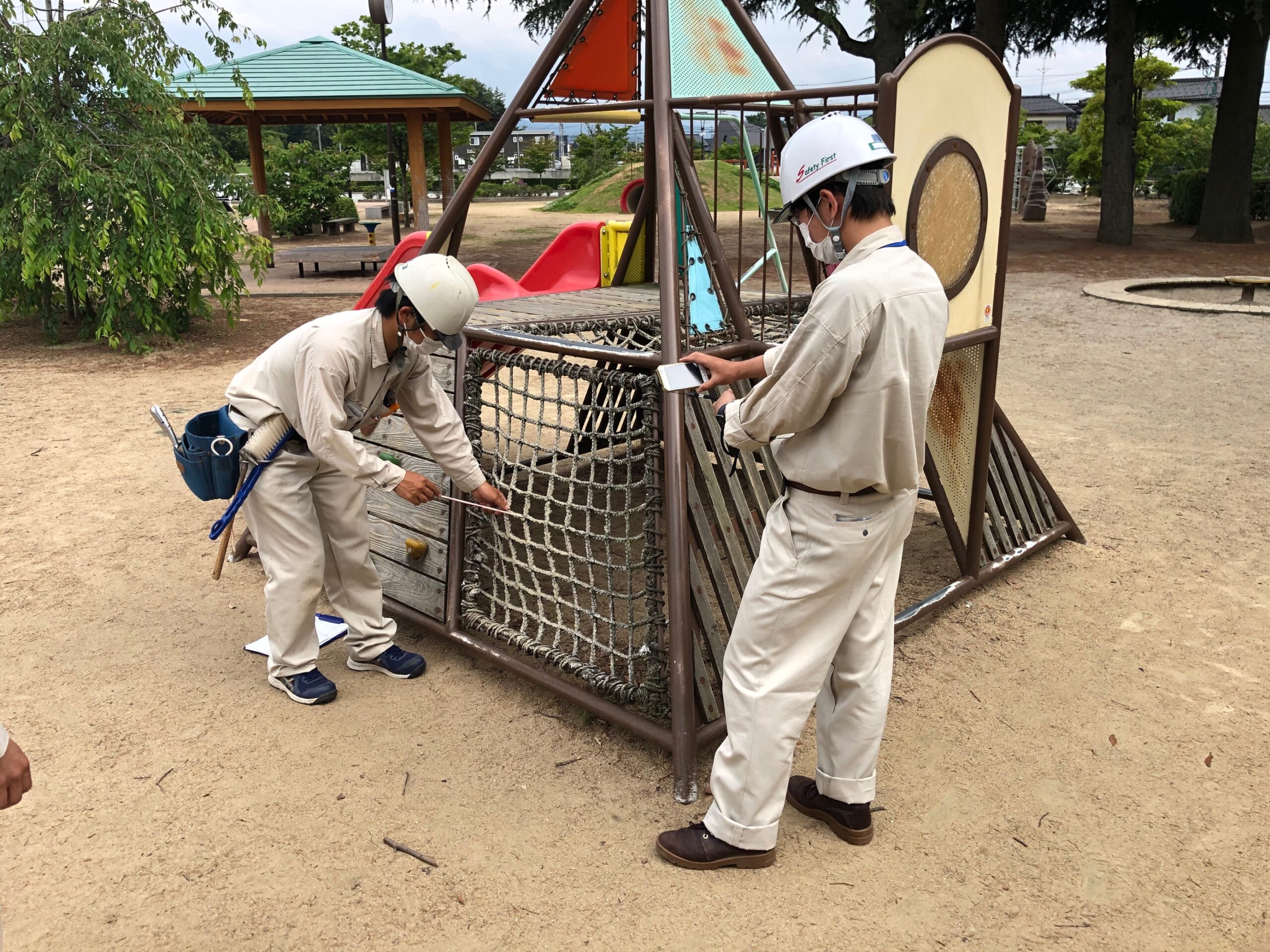 今週1週間、インターンシップの学生さんは公園施設部で砺波市・氷見市・滑川市の公園や、黒部市小学校の遊具点検補助員、報告書作成、サンプル製作などの業務を行っています。