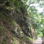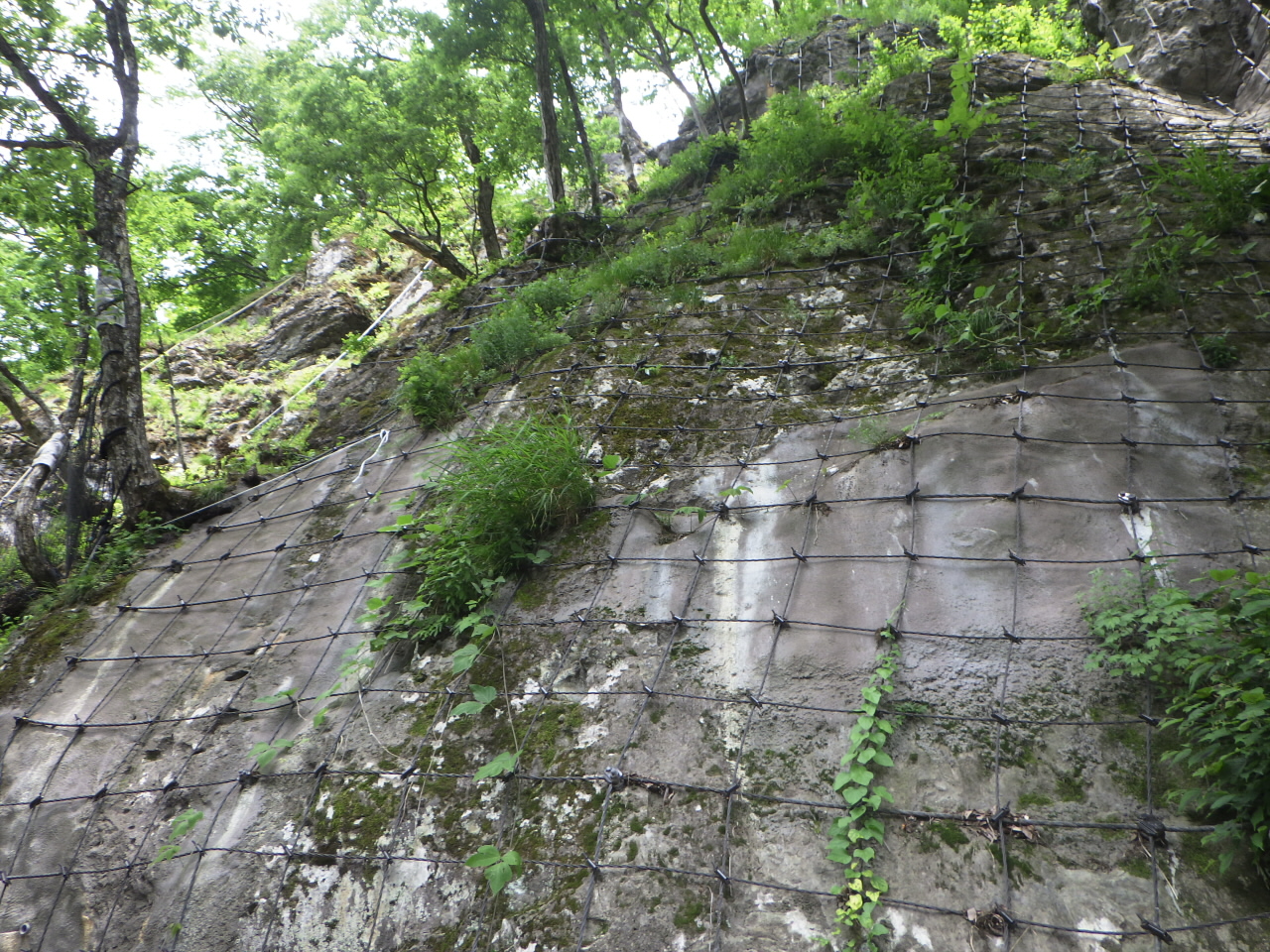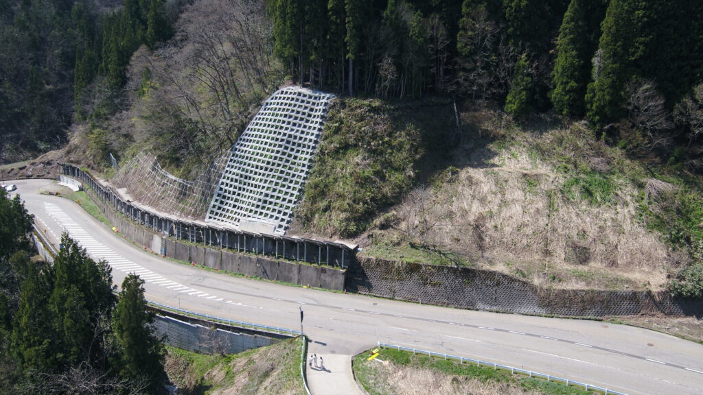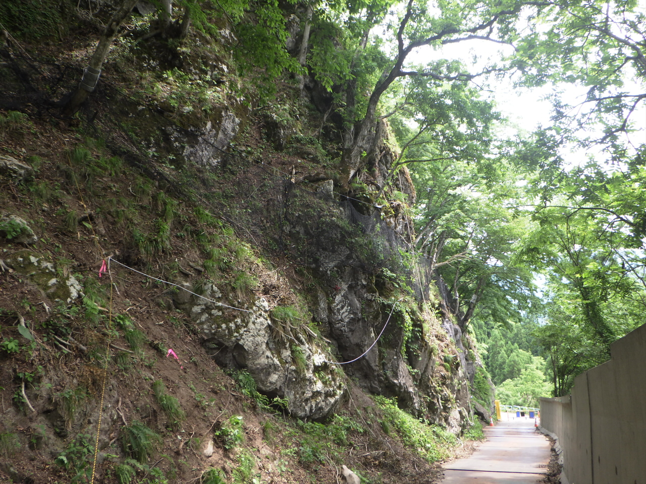 工事概要:世界遺産相倉合掌造り集落の直上の市道沿線にて法面の岩盤崩落を防止する工事。今年で同一箇所・同一工法による2期目の工事