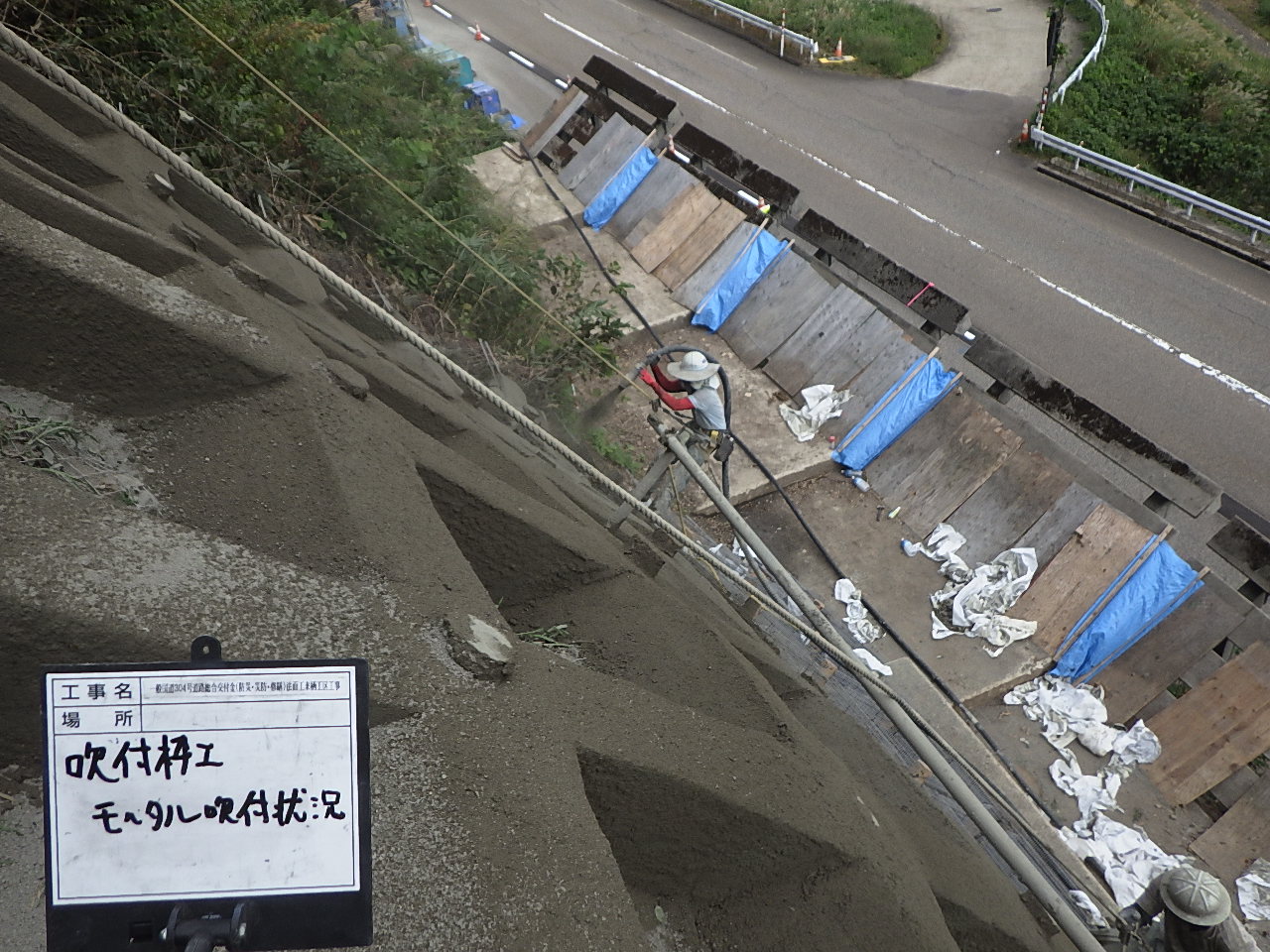 工事概要:地山の崩壊防止のため吹付枠工、鉄筋挿入工、枠内基盤材吹付を施す工事。 上記航空写真の法枠の続きから斜面の向きが変わる辺り(写真の中央やや左から中央付近)までが今年のおおよその範囲となります。弊社が当該法面を受注し4期目(同一工種としては3期目)の工事となります。