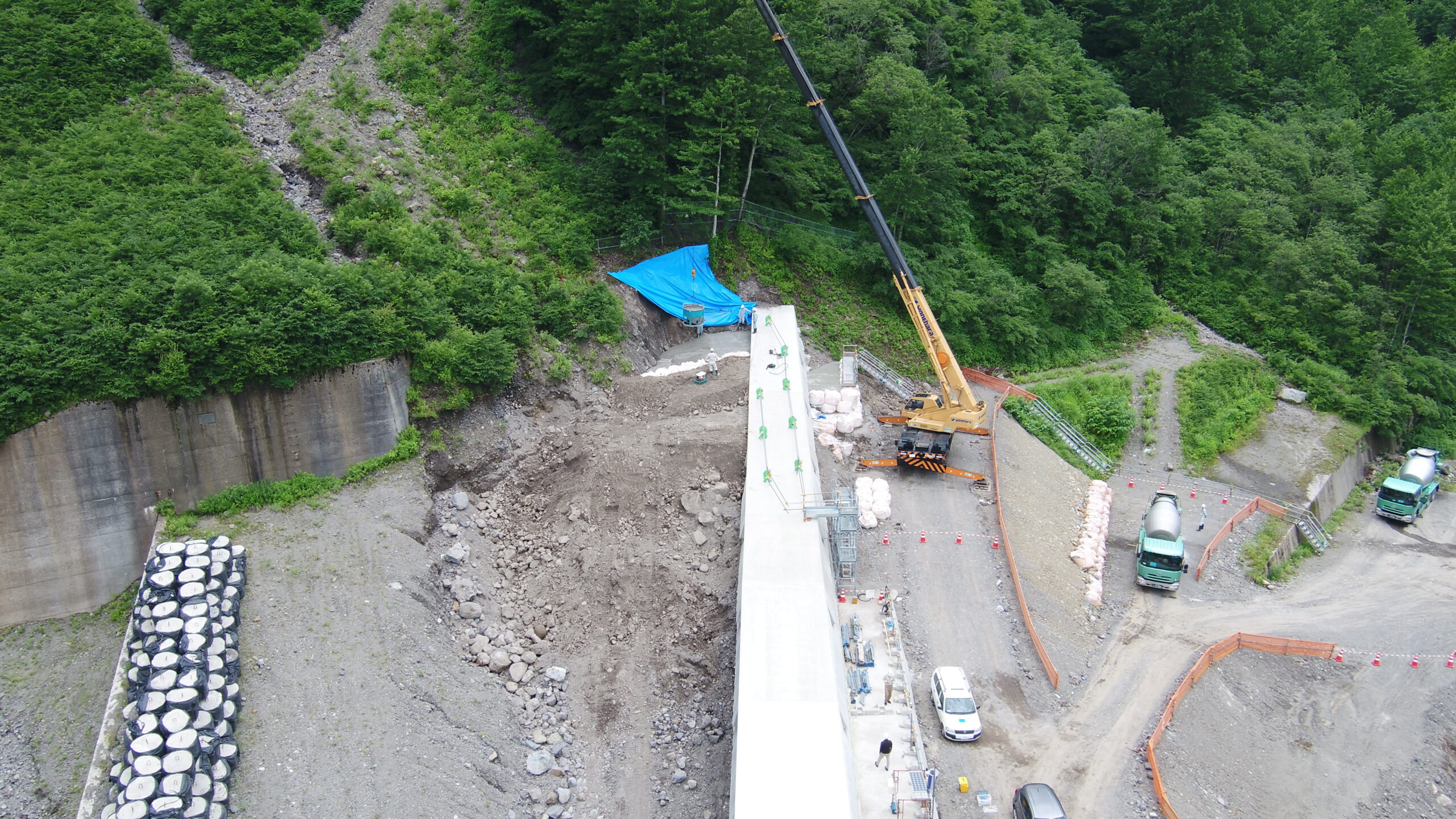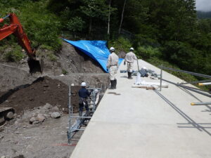 斜面崩壊の危険が大きい山側袖部の人工地山コンクリートの打設が完了し斜面崩壊の危険は回避され安心して今後の作業を進めることができるようになりました。
