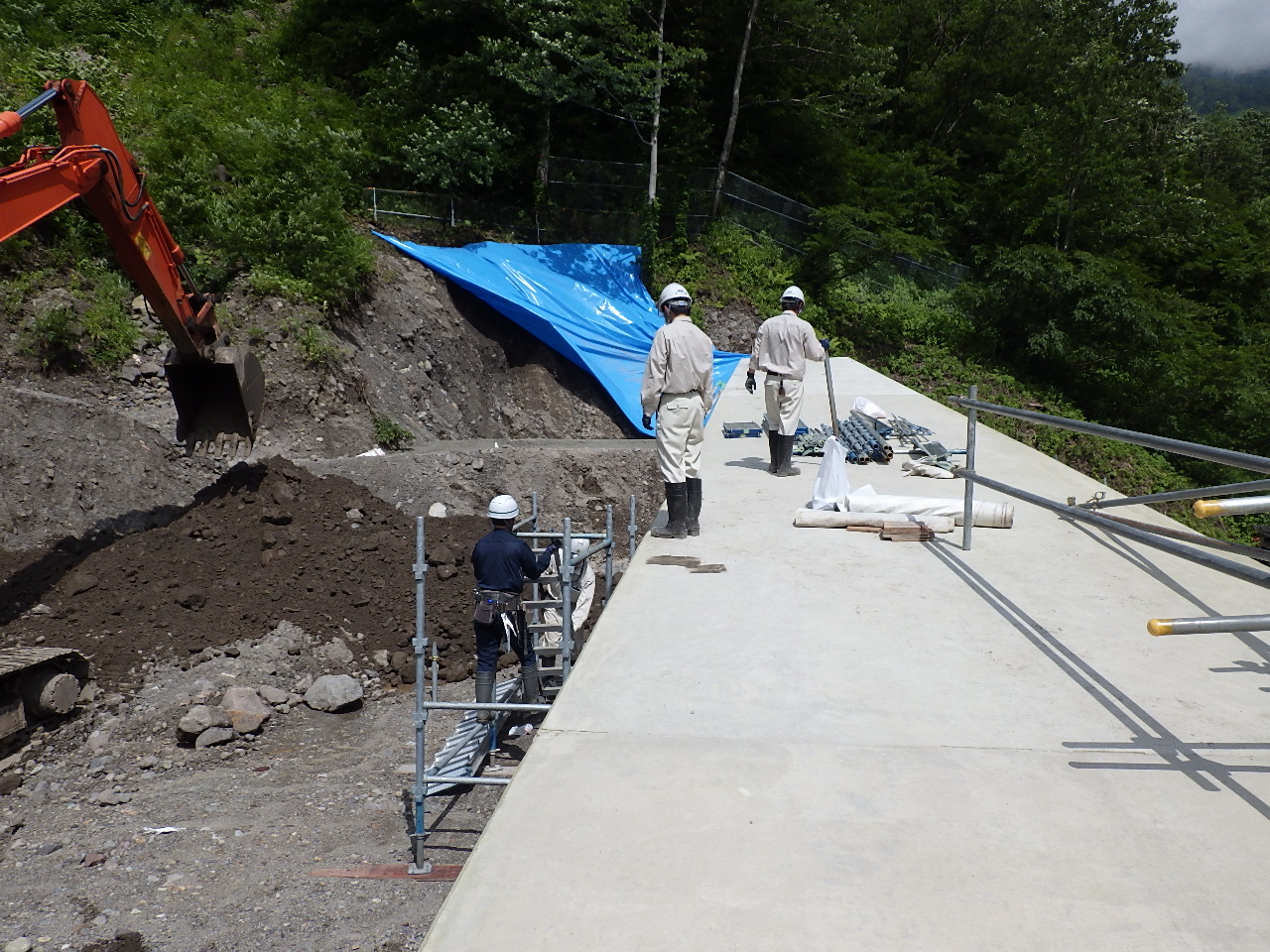 これでGW明けから開始した仮設工事もようやく完了し、いよいよ崩壊した斜面の斜面対策工を開始できます!