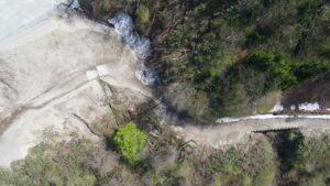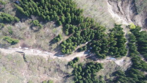 航空写真では、林道があるようにみえますが本工事では別ルートに取付くようになります。今後の工事進捗をお楽しみください。