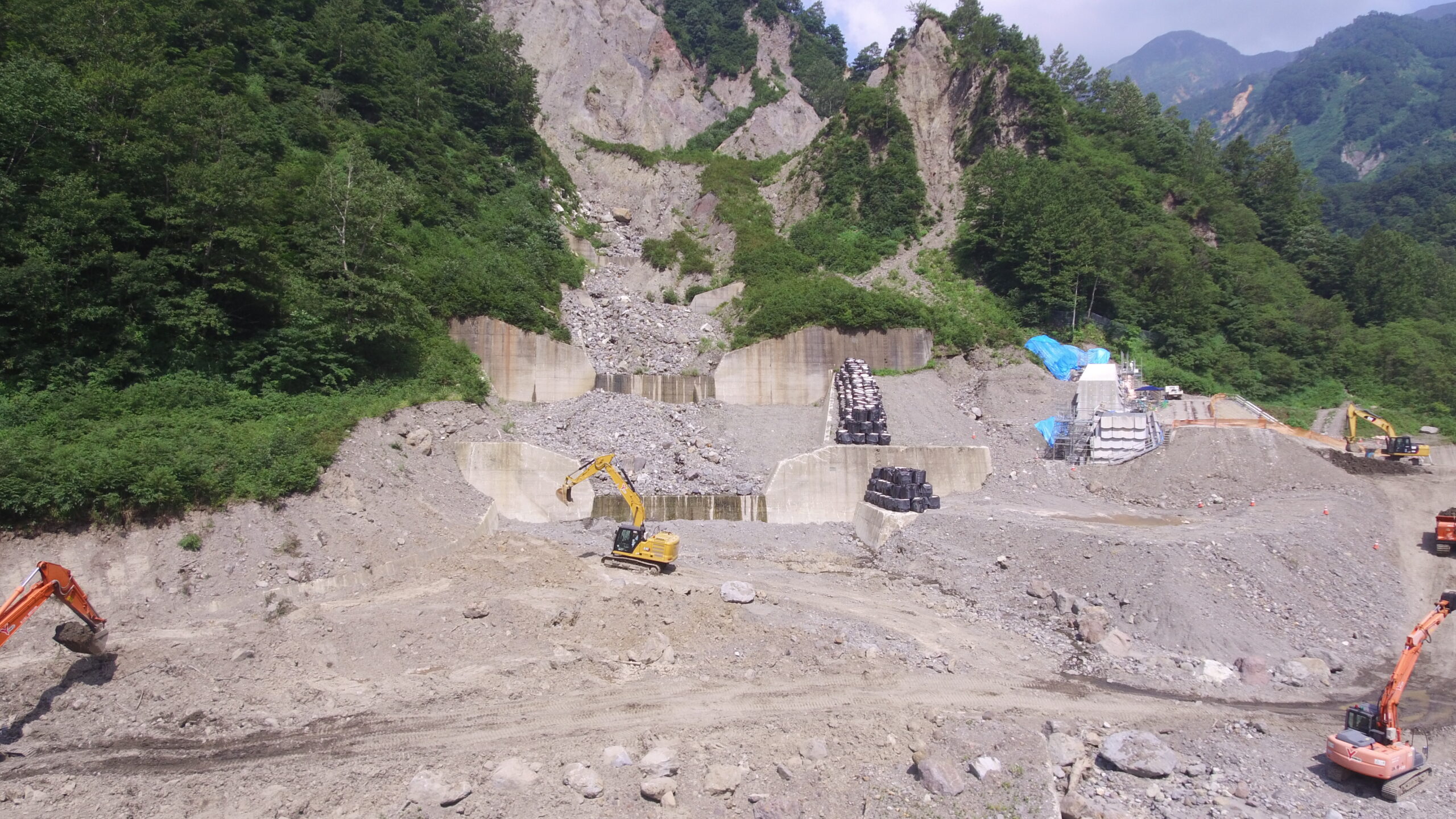 毎年富山県内の建設会社が力を結集し、土砂の流出を防止する砂防堰堤や、山の崩落を止めて緑化する法面工事を行うことで、多くの人々が暮らす富山平野の安全を守っています。