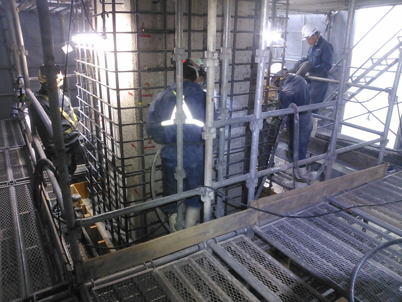 足場の高さもあるため、この狭い範囲の中でコンクリート打設を行っています。