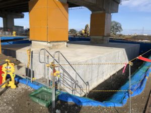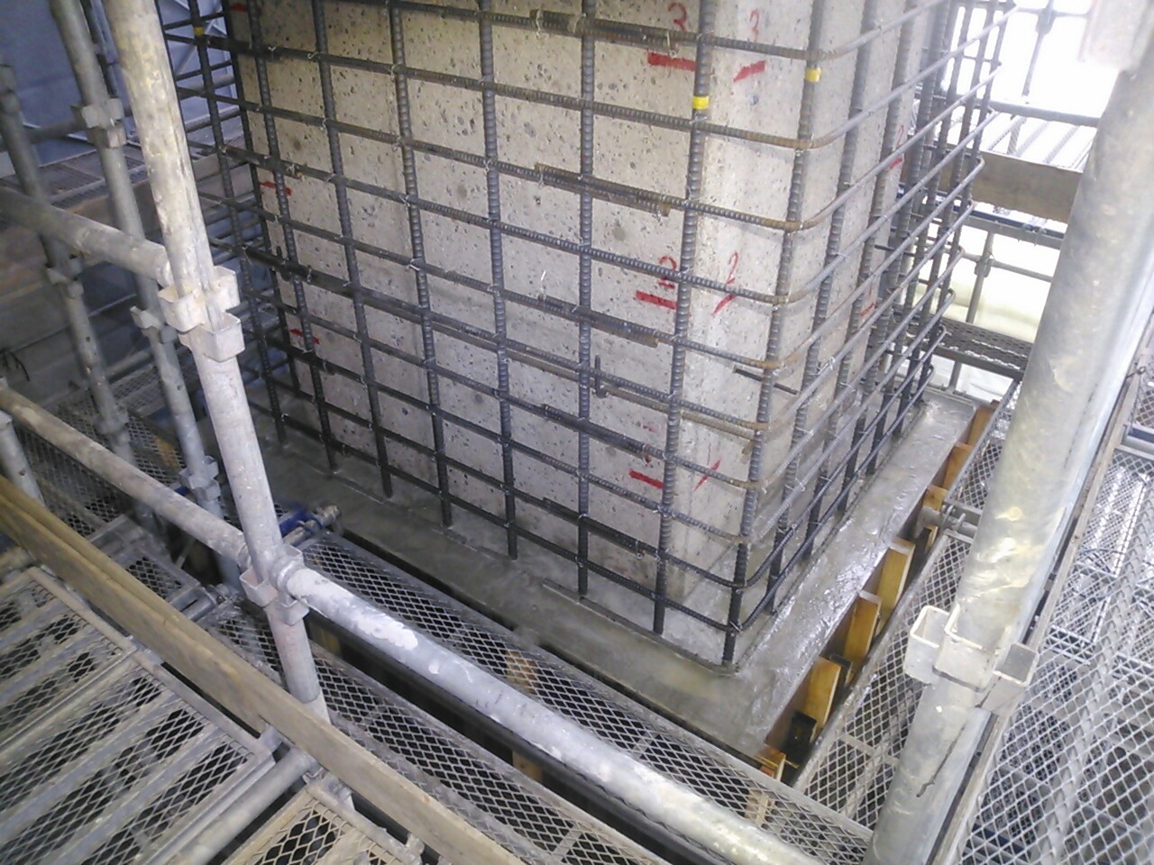 既設の橋脚に下地処理し、その周りにコンクリート打設を行っています。