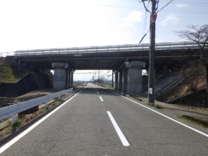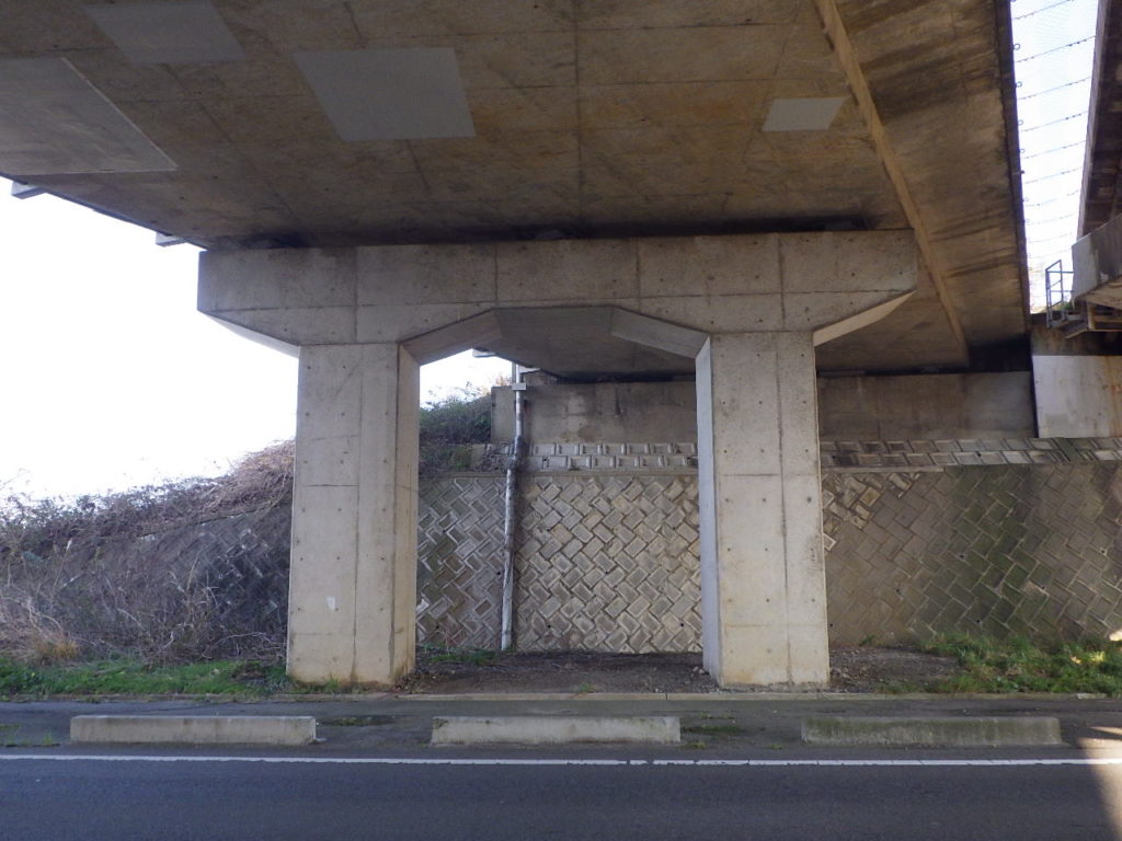 この鋼材は落橋防止装置といい、名前の通り上部の橋が落ちないようにする役割があります。写真では分かりませんが橋脚の後ろ側にも同様に設置されています。