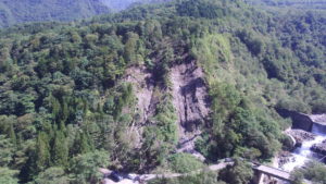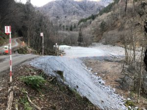 崩壊した斜面の上には奥飛騨温泉郷を結ぶ主要道路である一般国道471号があります。斜面の下には平湯川が流れており、平湯川下流域には福地温泉街や新平湯温泉街などの観光名所があります。今後、この斜面の崩壊が進むことによって、国道の崩落や下流域にある温泉街への土石流被害などの危険が及ぶことを防止するための工事です。