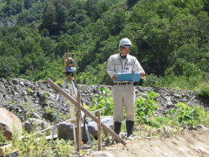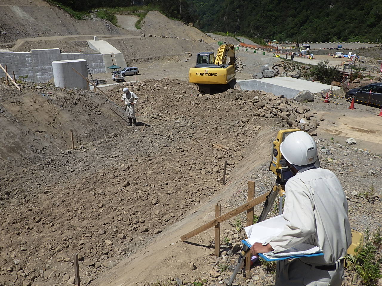 この写真は現場で測量をし、丁張をかけている様子です。丁張とは構造物をつくるときに目印となるものです。