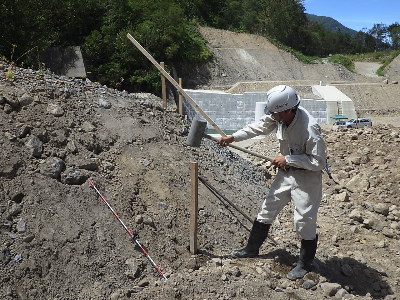 丁張は杭をカケヤ(木製のハンマー)を使って打ち込み立てるのですが、まっすぐ杭を打ち込むことは意外と難しいです。