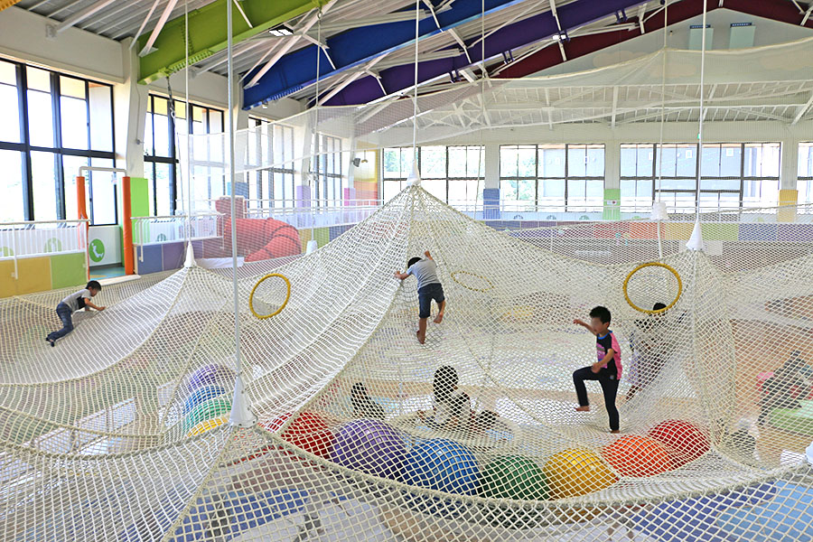 こういった屋内の大型ネット遊具を全国各地で施工しました。屋内遊具は天候に左右されずに遊ぶことができ、商業施設の集客の一つとして施工することも多くなっています。