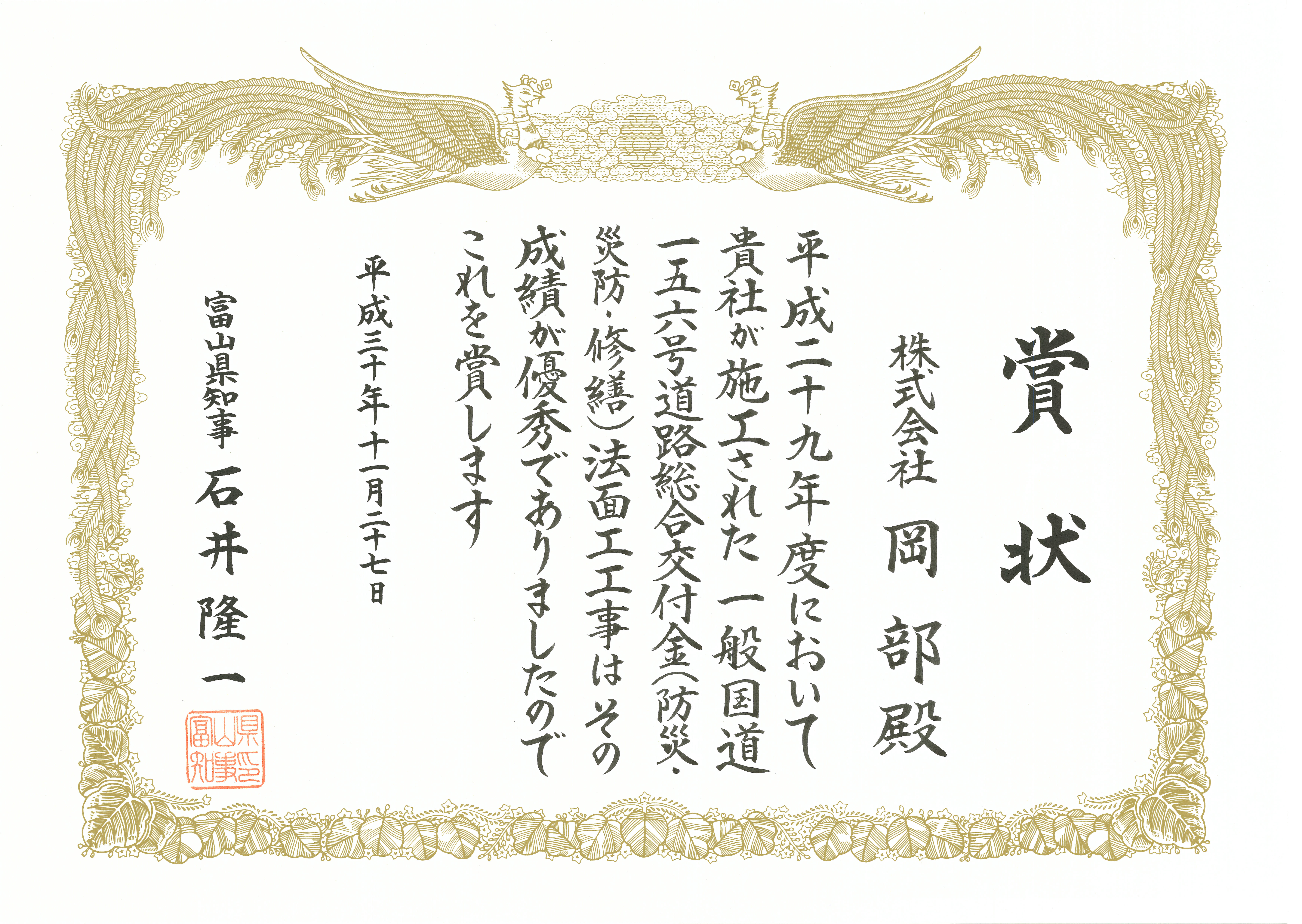 岡部が昨年施工した一般国道156号道路総合交付金(防災・災防・修繕)法面工工事が富山県建設優良工事表彰にて富山県知事賞を受賞しました。