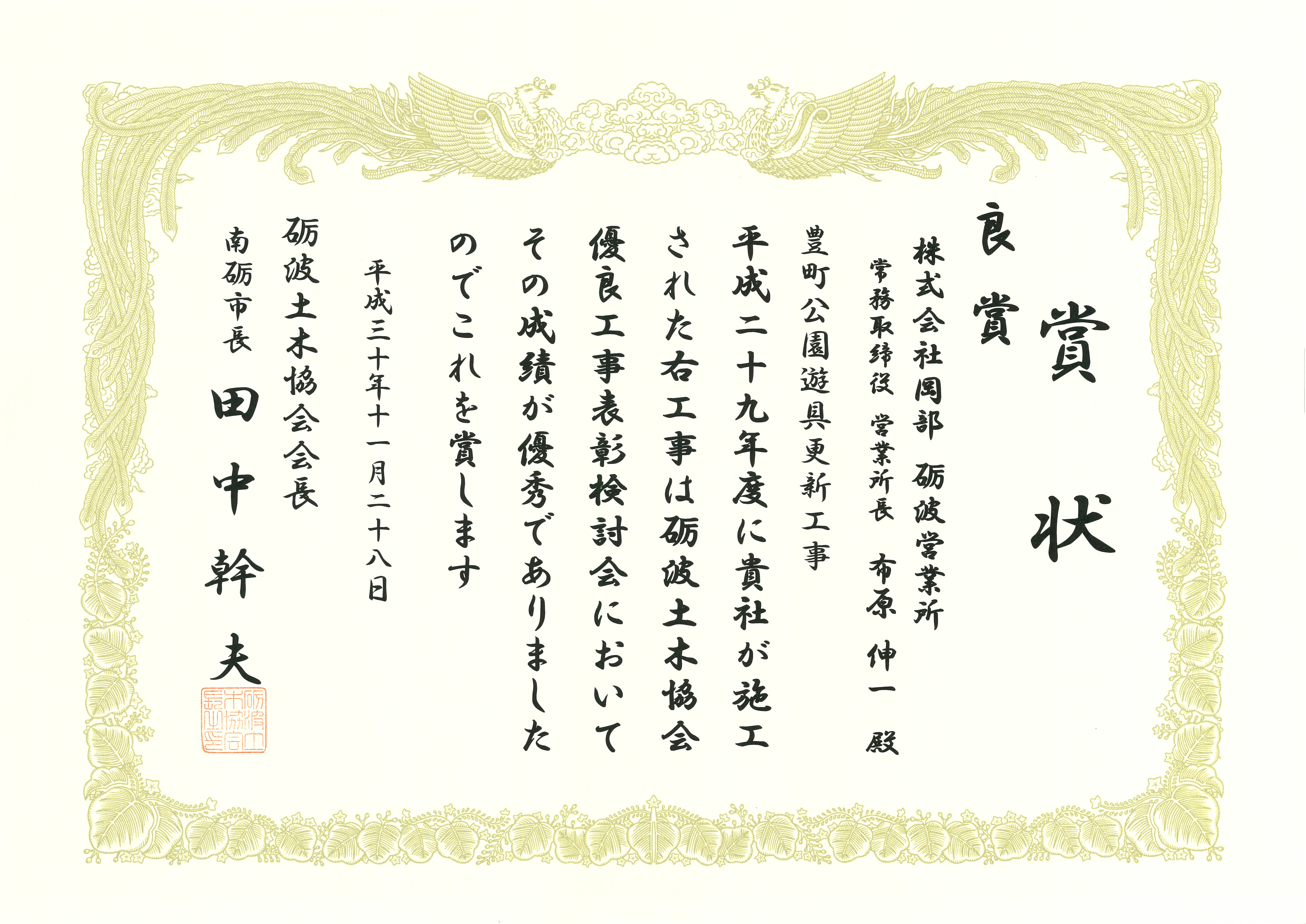 岡部が施工した豊町公園遊具更新工事が砺波土木協会優良工事表彰において良賞を受賞しました。