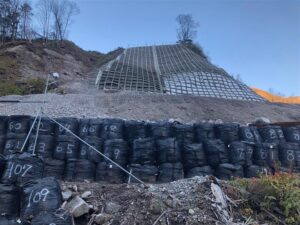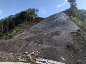 現在は、無事掘削が完了し法面保護工を施工しています。
