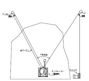 工事概要:法面上部の岩塊の落石予防のためロープ伏工を施す工事