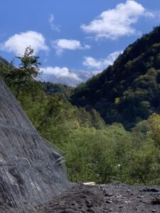 本工事はこれで施工完了ですが、当該法面はまだまだ崩壊した部分がそのままの状態で残っています。来年度以降も引続き受注できた際には、地元住民の皆様・奥飛騨地区の安全を守れるように頑張りたいと思います。