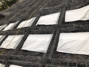 上の写真の金網の部分にモルタルを吹付け、白いシートの部分には種子の入った基盤材を吹付けます。