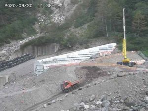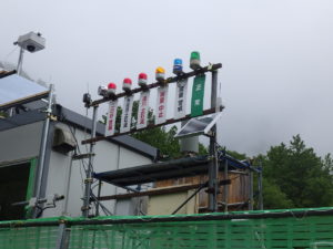 そこで、各業者が協力して土石流センサーを設置しています。当現場より上流2km~4kmにかけて9カ所の土石流センサーが設置されています。その信号を現場で受信し直ちに避難できる体制をとっています。また、雨量についても警戒、中止基準を設けてサイレンが鳴るようにしています。