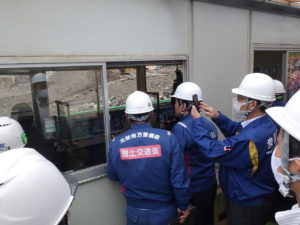 現場視察では本工事を視察し、北陸初となるICTマシンガイダンスによる無人化施工の施工状況を見ていかれました。