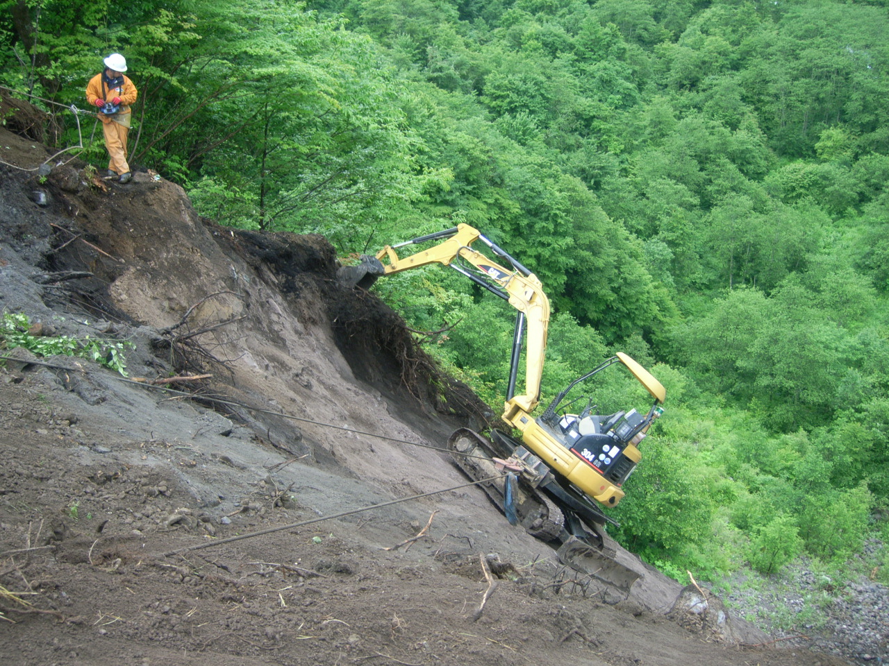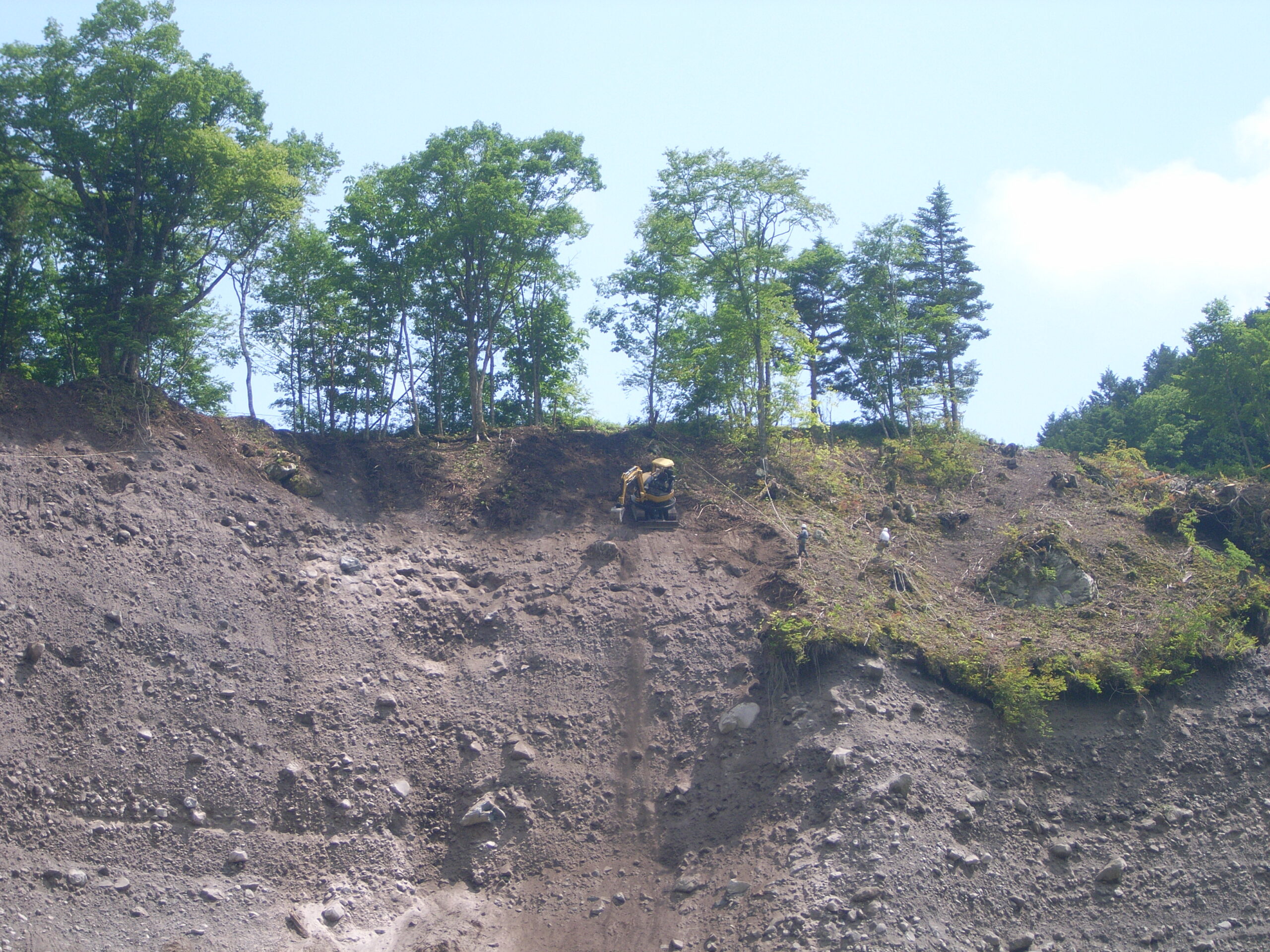 まず、今週からは崩壊斜面上に堆積した土砂・木根の掘削作業を行います。