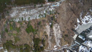 本工事はこれで施工完了ですが、当該法面はまだまだ崩壊した部分がそのままの状態で残っています。来年度以降も引続き受注できた際には、地元住民の皆様・奥飛騨地区の安全を守れるように頑張りたいと思います。