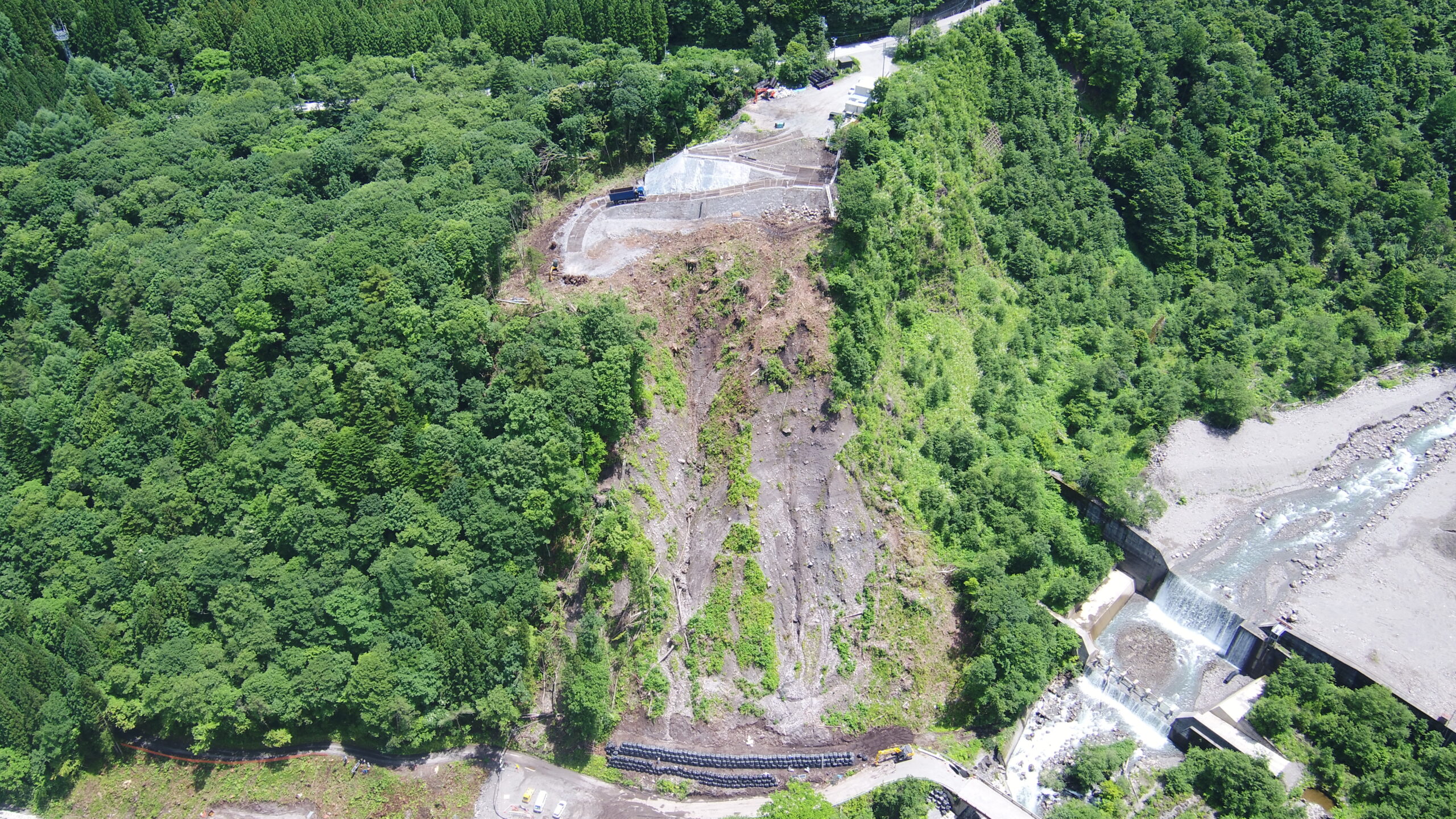 これでGW明けから開始した仮設工事もようやく完了し、いよいよ崩壊した斜面の斜面対策工を開始できます!