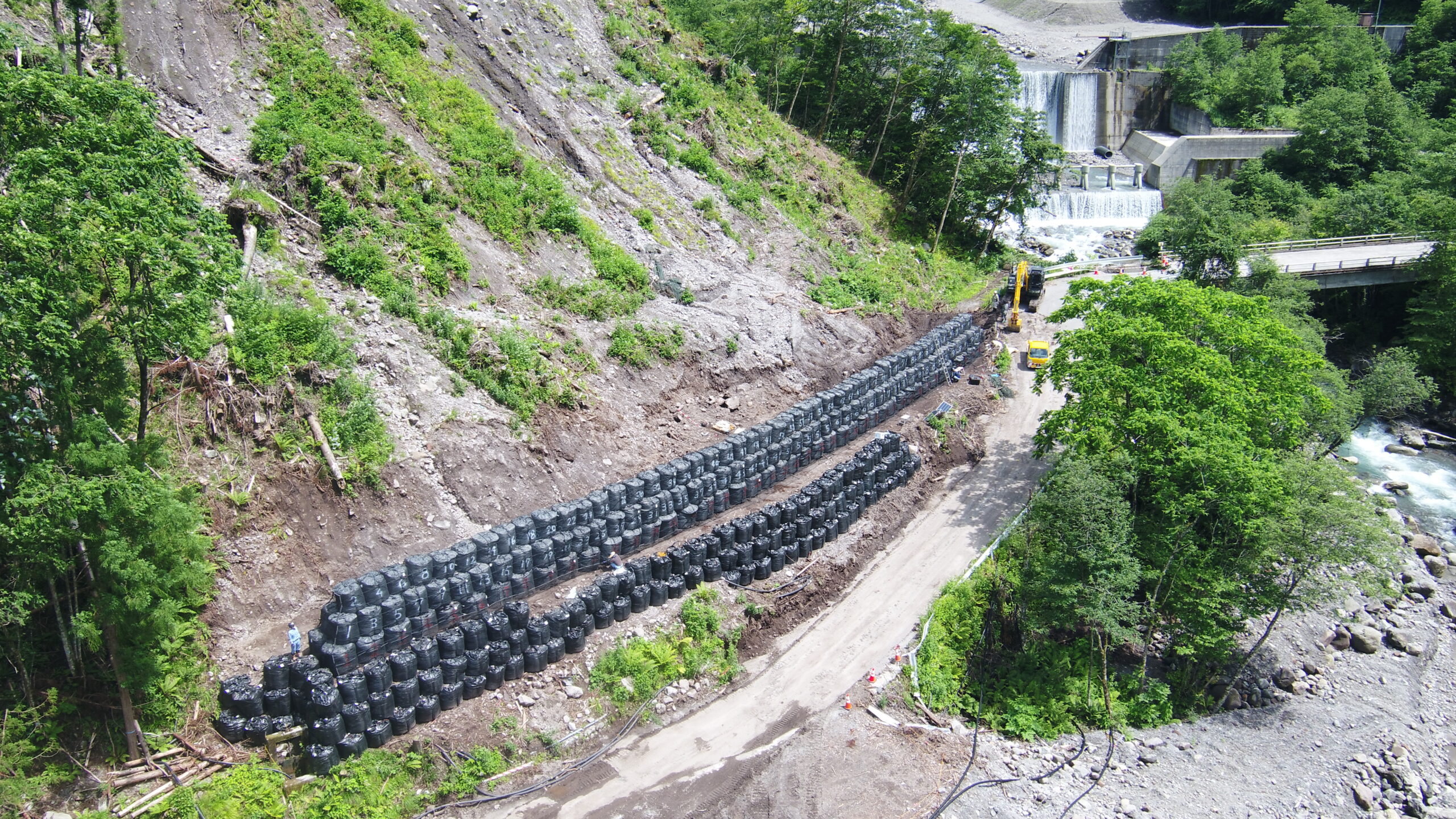 ・斜面下に今後の掘削工施工時の落石防護として、大型土のうで擁壁ができました
