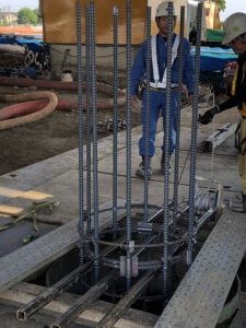 一見するとわかりにくいですが、どのような順番で組立てるかを想像できないと組めませんし、結束(鉄筋同士の固定)も上手い、下手がよくわかる仕事だと思います。