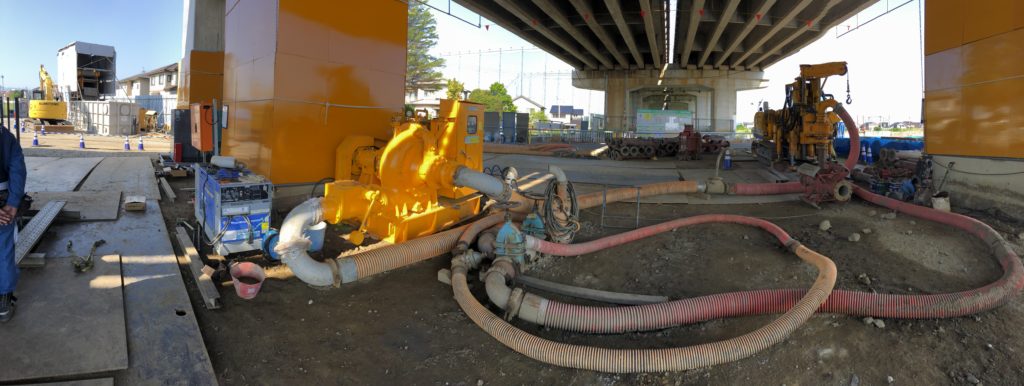 こんな感じです。安定液で孔内を満たして孔壁が崩れるのを防ぎつつ掘削土砂を排出し循環しながら掘削をおこなっていきます。機械の頭にモータがついていることからトップドライブです・・・多分。