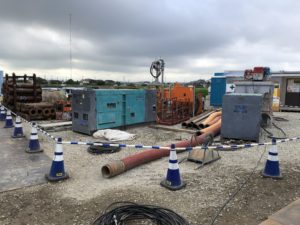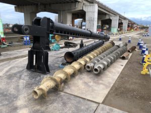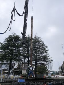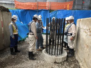 本工事の杭は場所打ち杭です。これは、その場で穴を掘って鉄筋を入れて生コンを打設する杭と言う意味です。