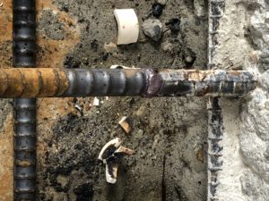 よく見ないとわかりにくですが、左側から出ている鉄筋に右側の高さが変化している鉄筋を接合しています。