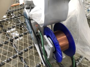 右の溶接ワイヤーを鉄筋同士の隙間に充填していく工法です。